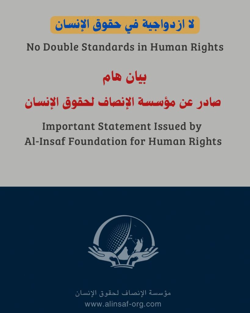 لا ازدواجية في حقوق الإنسان تعلن مؤسسة الإنصاف لحقوق الإنسان رفضها الصريح وإدانتها الواضحة للنهج الانتقائي في الخطاب الحقوقي الدولي، ولا سيّما ما صدر عن مكتب المفوض السامي للأمم المتحدة […]