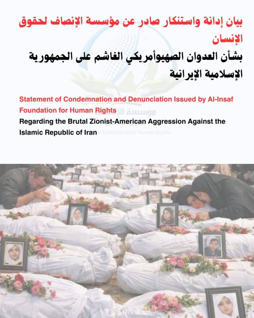 بيان إدانة واستنكار صادر عن مؤسسة الإنصاف لحقوق الإنسان تُدين وتستنكر مؤسسة الإنصاف لحقوق الإنسان بأشد العبارات العدوان السافر الذي تشنه القوات الصهيوأمريكية ضد أراضي الجمهورية الإسلامية الإيرانية، وتؤكد المؤسسة […]