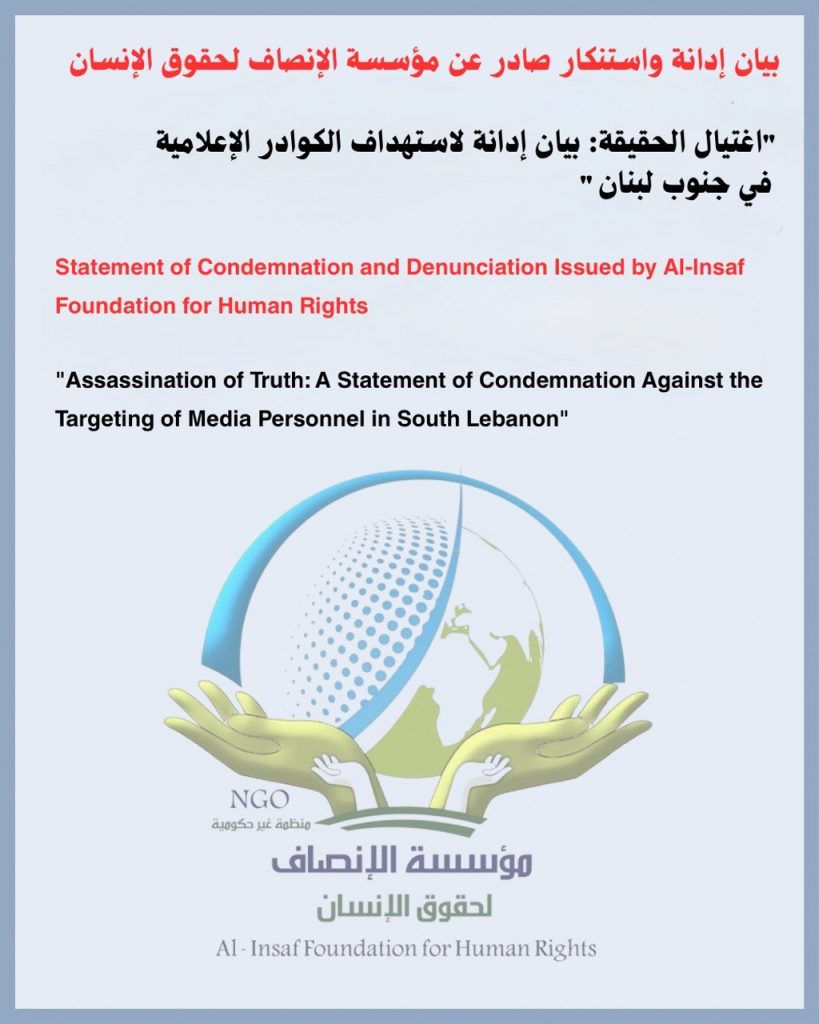 تُعرب مؤسسة الإنصاف لحقوق الإنسان عن إدانتها القاطعة واستنكارها الصارخ لجريمة الاغتيال الممنهجة والآثمة التي استهدفت اليوم فرسان الحقيقة في جنوب لبنان، الصحفي علي شعيب (مراسل قناة المنار) والصحفية فاطمة […]