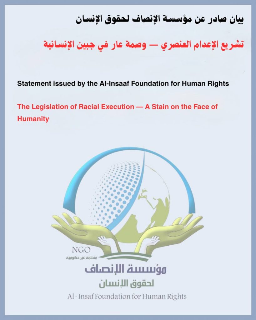 تشريع الإعدام العنصري — وصمة عار في جبين الإنسانية تُصدر مؤسسة الإنصاف لحقوق الإنسان هذا البيان بأشد العبارات وأكثرها وضوحاً وحزماً، في مواجهة هذا التصعيد الإجرامي غير المسبوق، مؤكدةً أن […]
